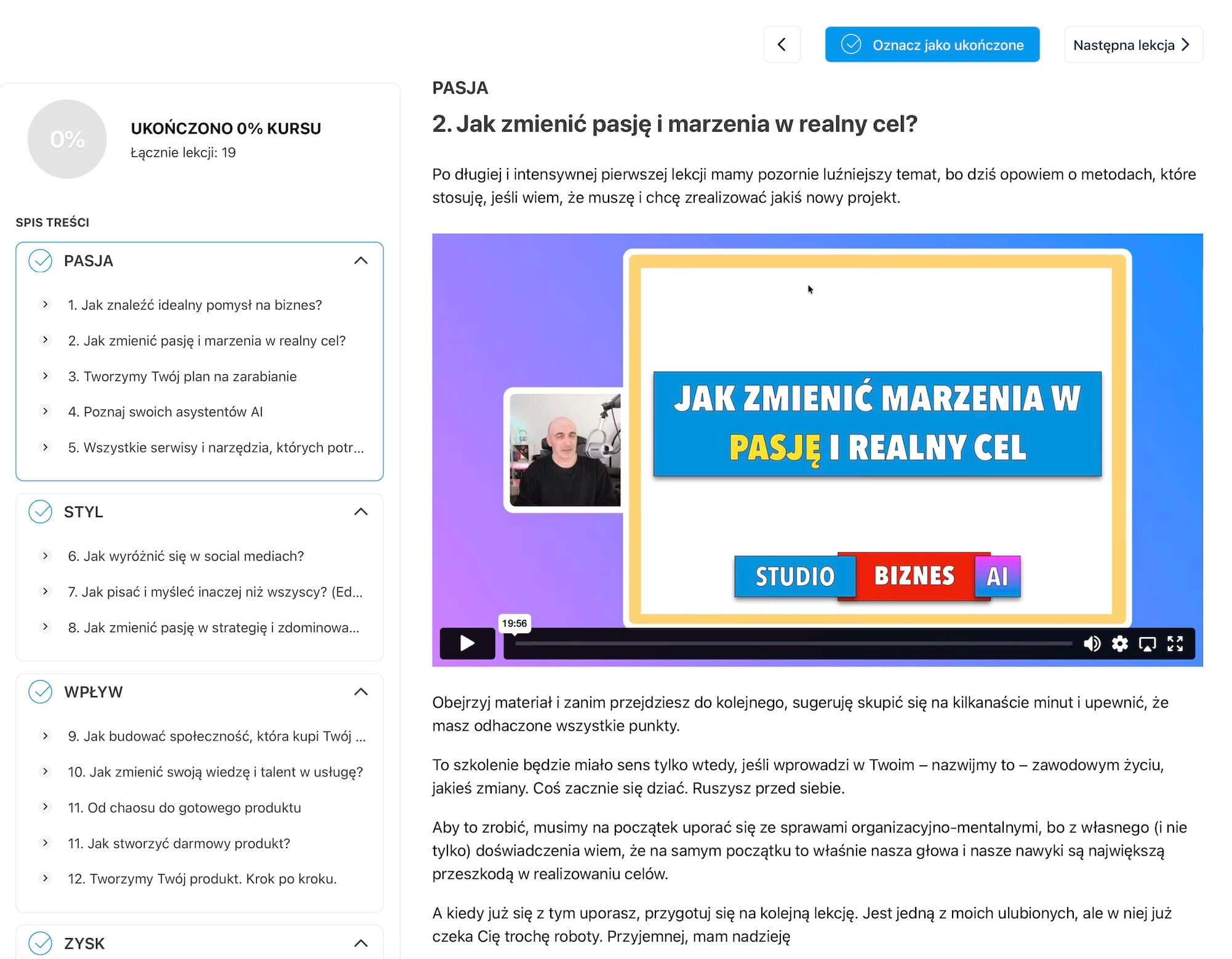Sam wykład trwa około godziny, na końcu mówię o szkoleniu Studio Influencer AI.